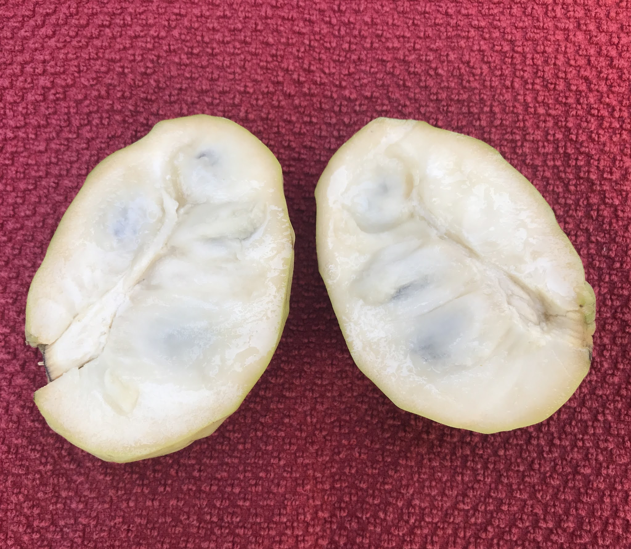 This cultivar was registered by Nino Cupaiuolo with the California Rare Fruit Growers in 1997. Fortuna is not distributed widely, as it did not make it to any of the large commercial nurseries. La Verne propagates many other cherimoya cultivars, but not Fortuna. Five years ago I was gifted a small grafted tree by a friend in Southern California. The tree made it through couple of first harsh winters we had in Davis, and finally started to produce. I do not expect to get a lot of fruits, as the tree is growing in a very densely planted bed along with a few other trees. Like many home gardeners I grow too many trees in too little space. Never the less, today I harvested a very nice sweet fruit. I believe this cultivar deserves a better distribution. An important attribute of this cultivar is its early fruiting time, that should allow to harvest the fruits before the frosts. We occasionally have them in the Sacramento Valley.
