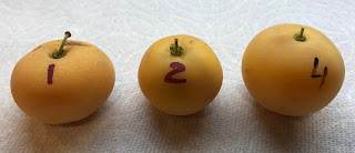 Females #1 and #2 produced just a few fruits this year. #1 has unusually dense flesh and more flattened shape than an average kei apple. Below are the fruits I tasted on November 15, 2020.